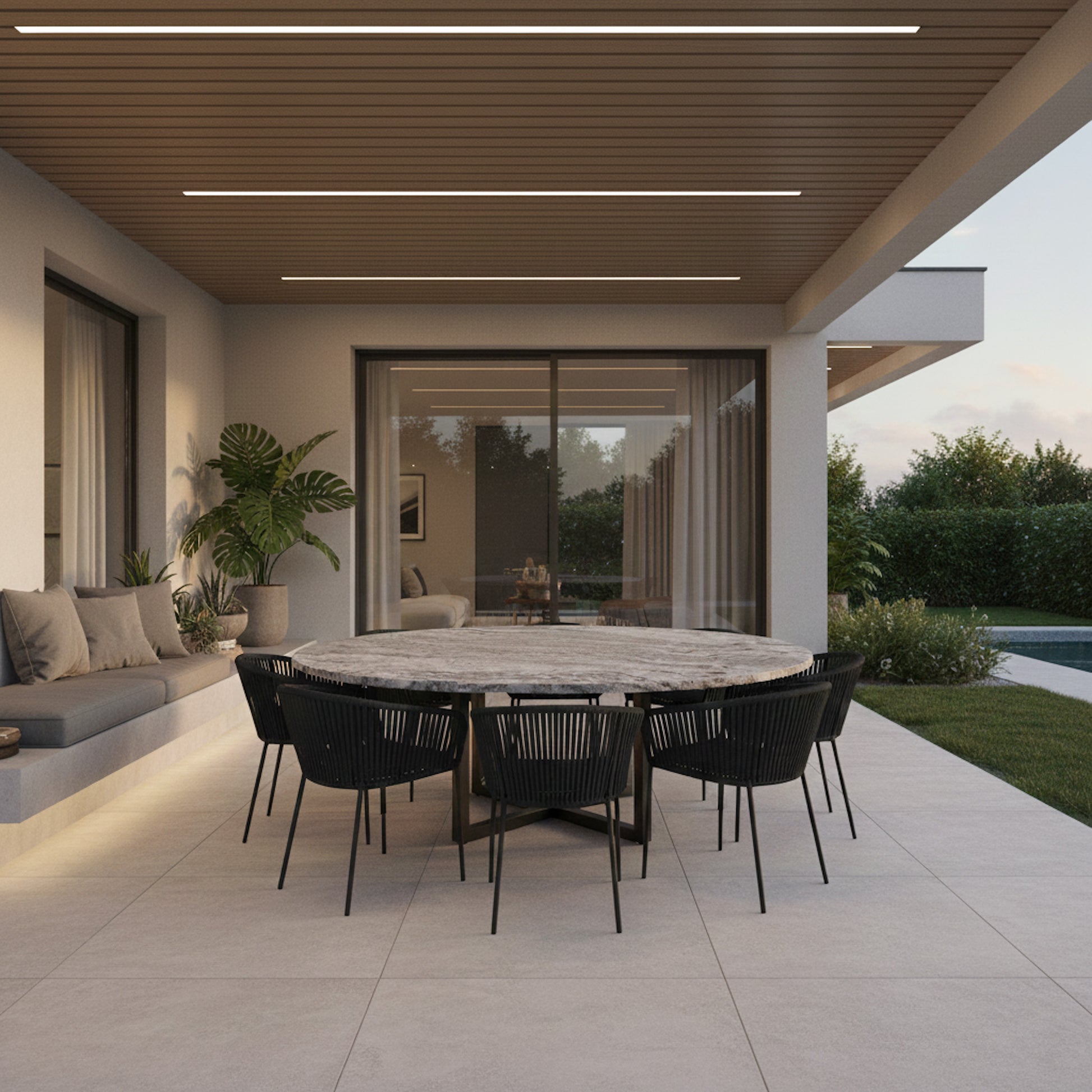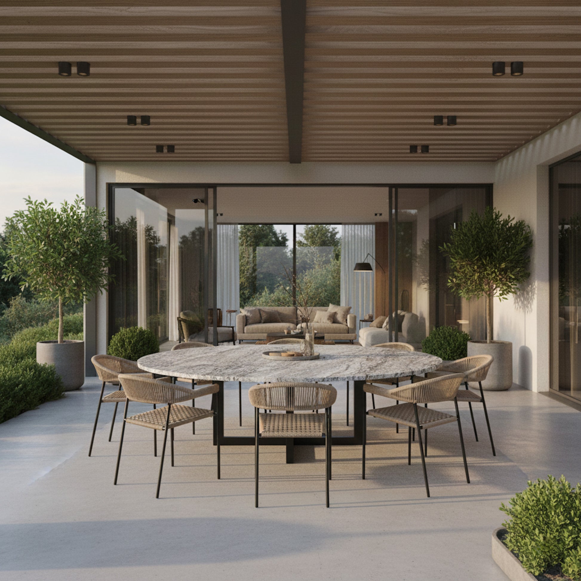 Cada pieza es única, resaltando las vetas naturales y los tonos suaves del granito Viscount Grey, que se adapta a cualquier estilo de decoración. Ideal para comedores y terrazas. Esta mesa no solo es funcional, sino también una obra de arte hecha a mano con la más alta calidad.