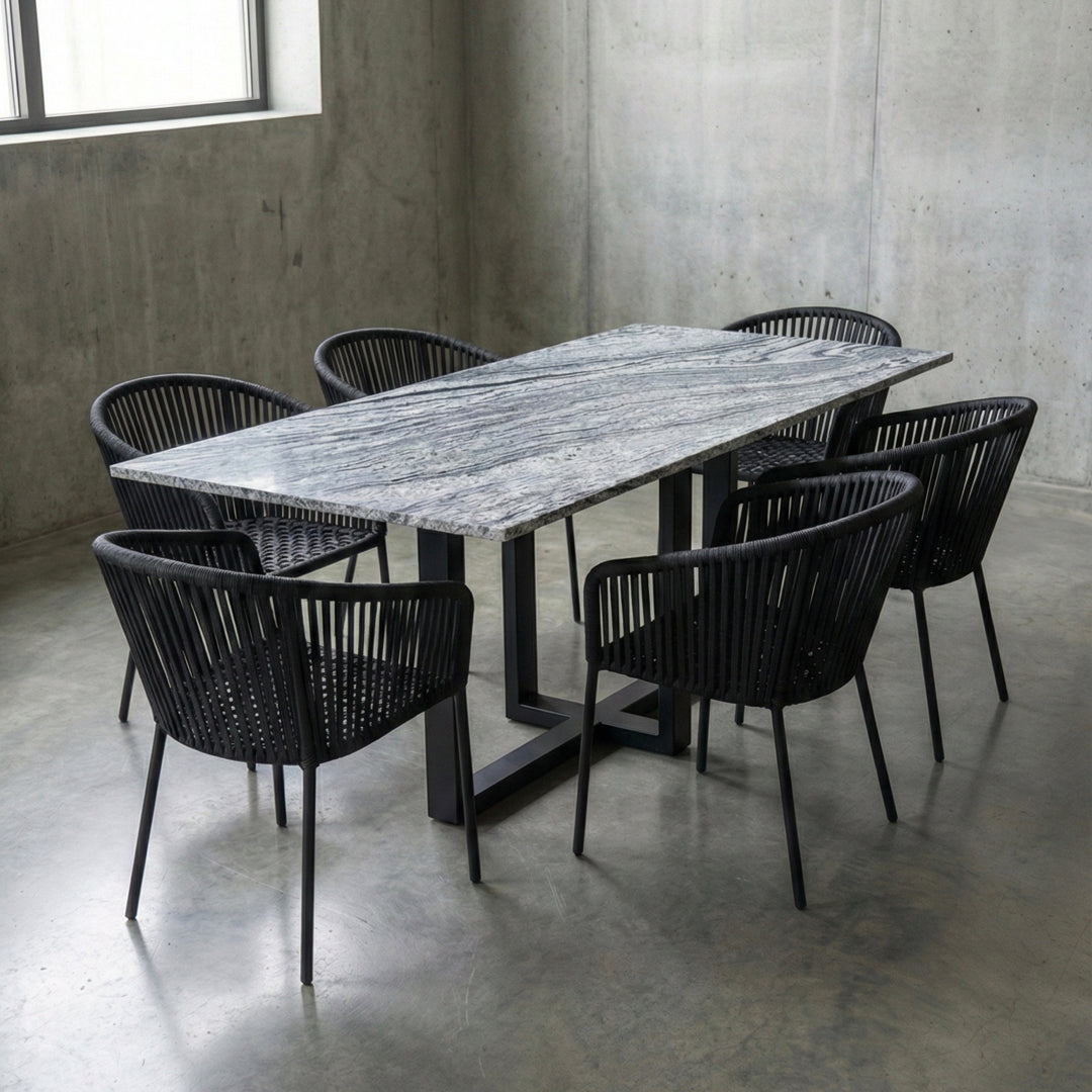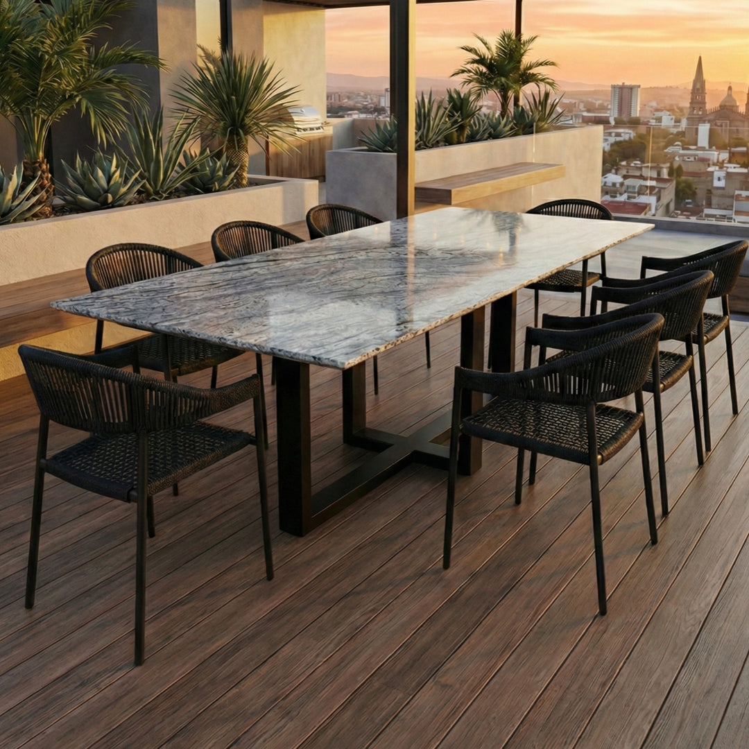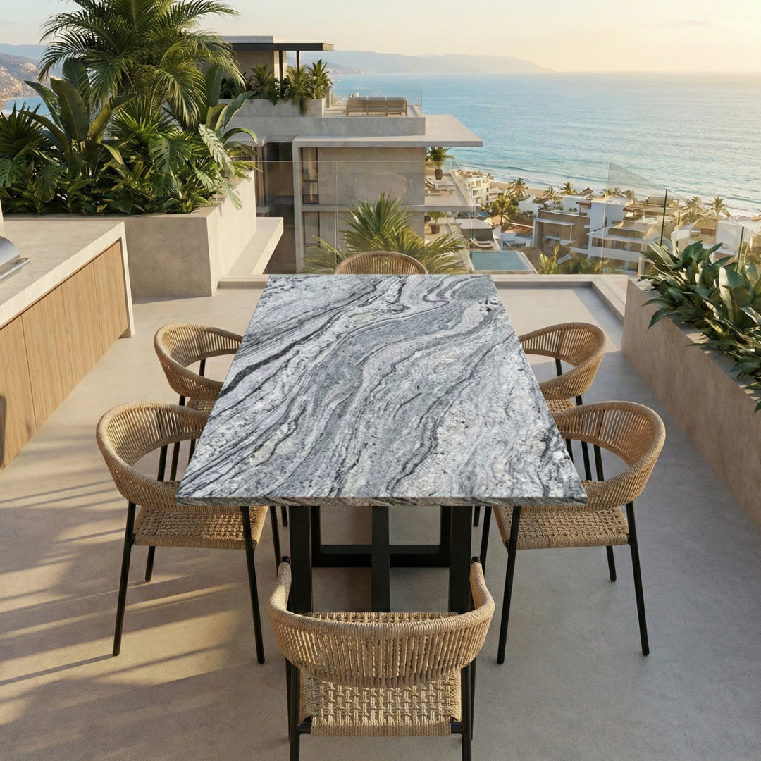Cada pieza es única, resaltando las vetas naturales y los tonos suaves del granito Viscount Grey, que se adapta a cualquier estilo de decoración. Ideal para comedores y terrazas. Esta mesa no solo es funcional, sino también una obra de arte hecha a mano con la más alta calidad.