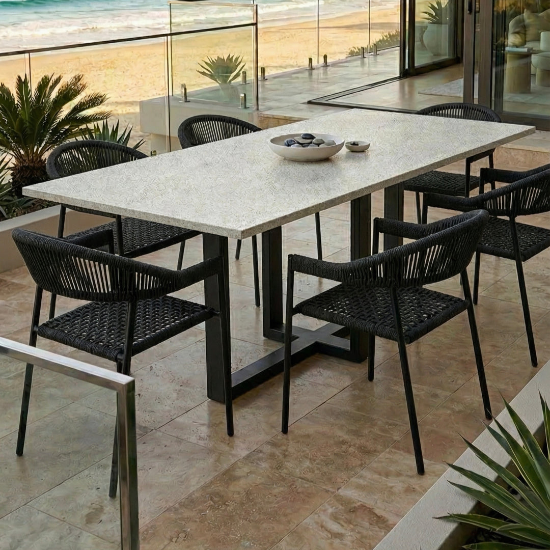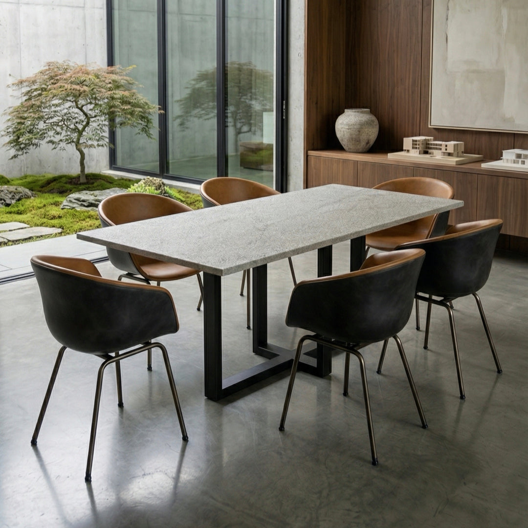 Cada pieza es única, resaltando las vetas naturales y los tonos suaves del granito Itaunas, que se adapta a cualquier estilo de decoración. Ideal para comedores y terrazas. Esta mesa no solo es funcional, sino también una obra de arte hecha a mano con la más alta calidad.