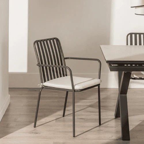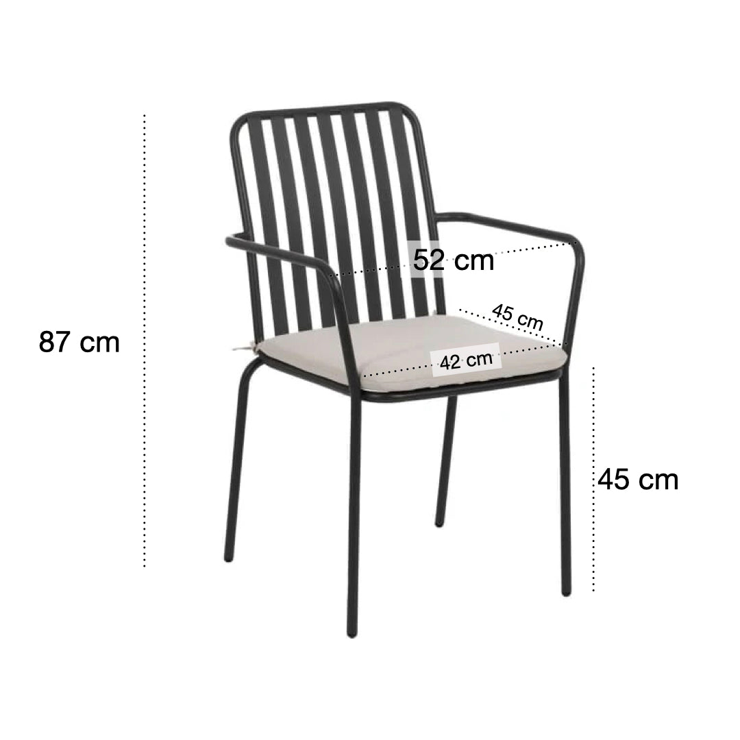 Esta silla de acero está diseñada para resistir las condiciones del exterior, ofreciendo durabilidad y estilo en cualquier espacio. Su estructura está recubierta con una pintura electrostática de alta calidad, que la protege eficazmente contra los efectos del agua y los rayos solares, asegurando que su color y acabado permanezcan intactos con el paso del tiempo.